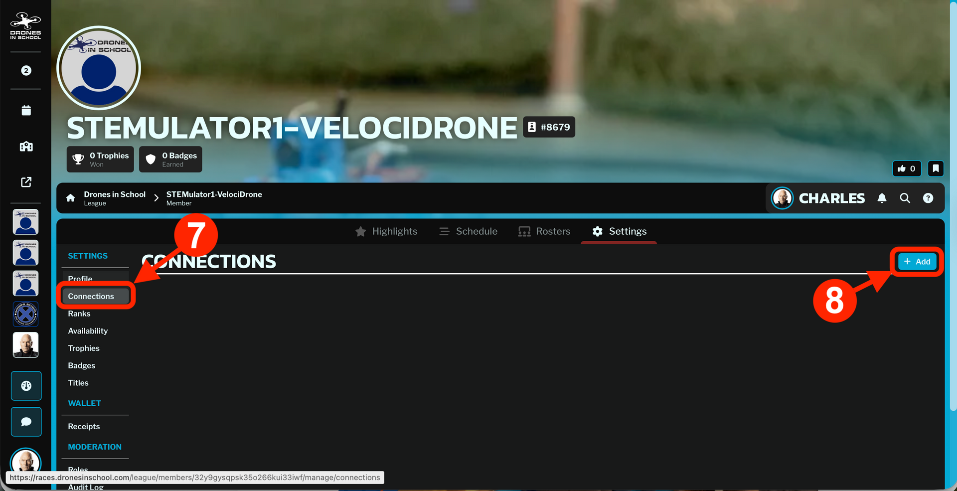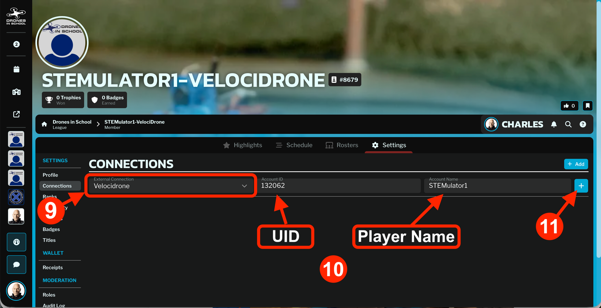 (NOTE: Each VelociDrone User ID (UID) can only be entered in RACES one time. You cannot create multiple connections to the same VelociDrone account. If you get an error when clicking the "+" to add the connection, then the VelociDrone account is probably already connected to another member. Please email us at info@dronesandschool.com for assistance.
