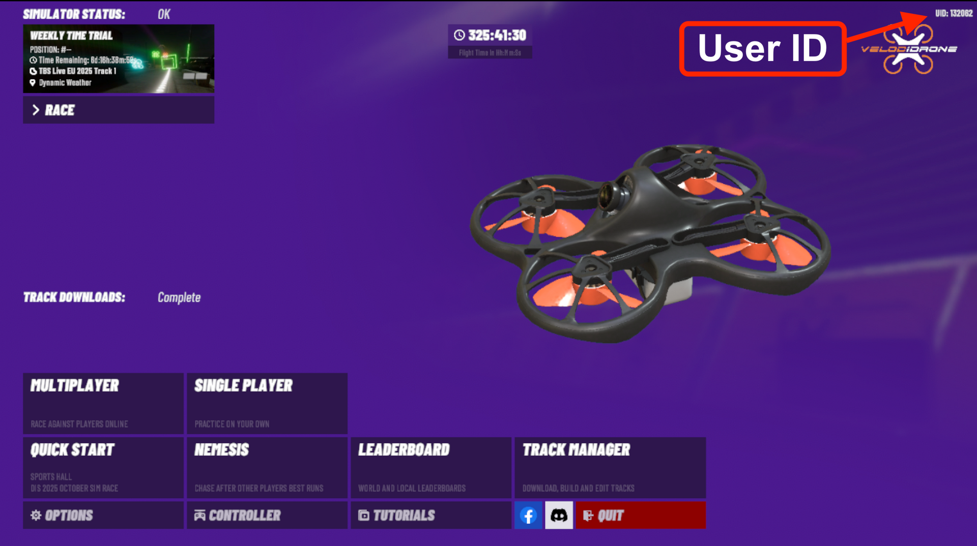 Open VelociDrone and find your User ID (UID) in the upper right corner of the main screen.